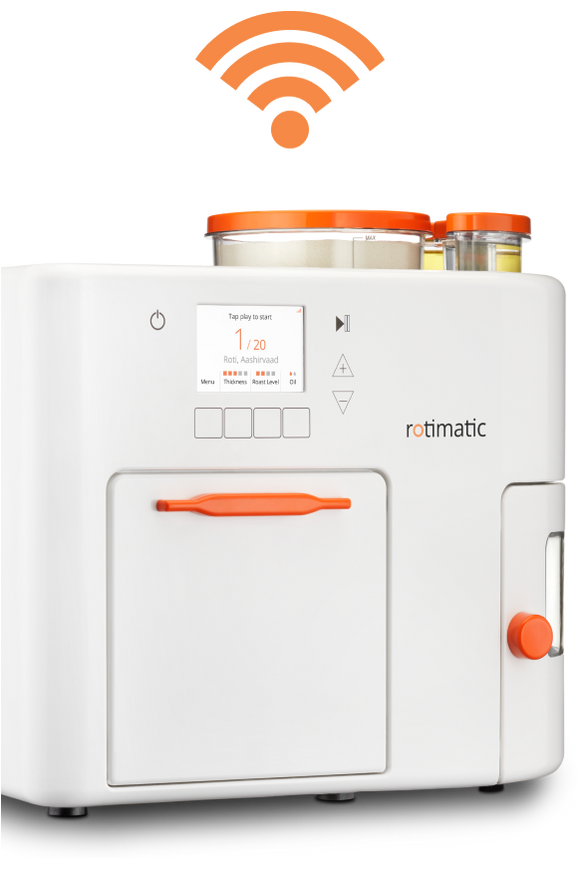 Rotimatic is the world's first robotic kitchen appliance. It measures atta, mixes and kneads it into a dough, and then makes a perfect dough ball. This is then flattened evenly and cooked to make round, evenly thin, and completely puffed, golden brown chapatis. All in 90 seconds.